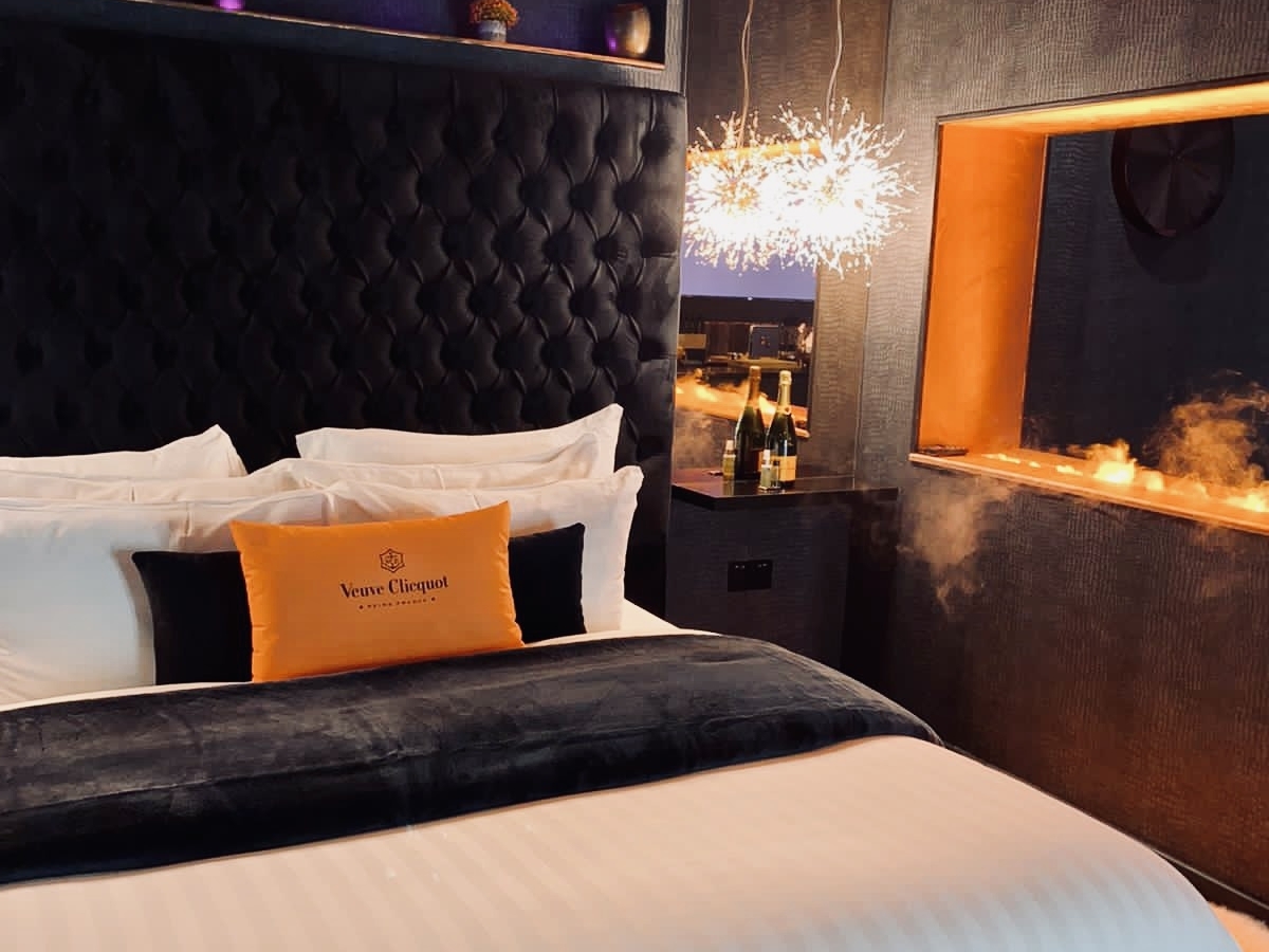 We have gone all out to create an experience like no other, for our guests. The Crib has it all! As you step into the Copper Crib you will enter via the lounge area and you will be struck by our sleek black and copper theme. The lounge area features a plush and cosy day bed, here you can sit back and watch your favourite blockbuster on your private screen to give you the feeling that you're in your very own cinema. To make the space even more unique and full of ambience, the ceiling is lined with white LED lights, creating the illusion that your sitting under a starry night sky, combined with a glass feature to enjoy in the ceiling, all from the comfort of the sofa.