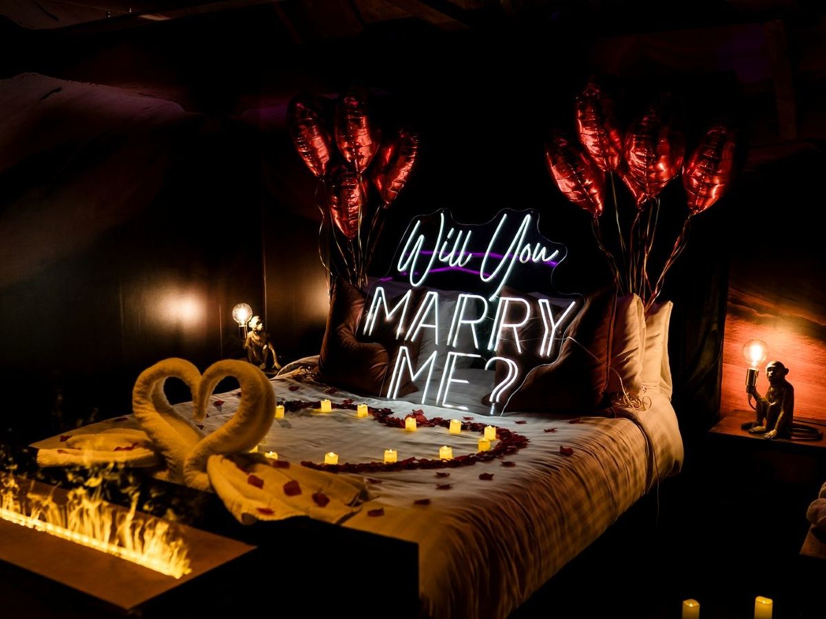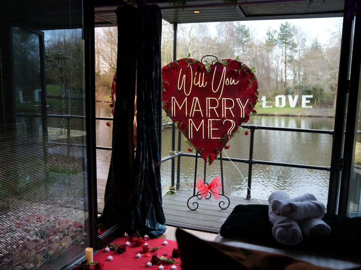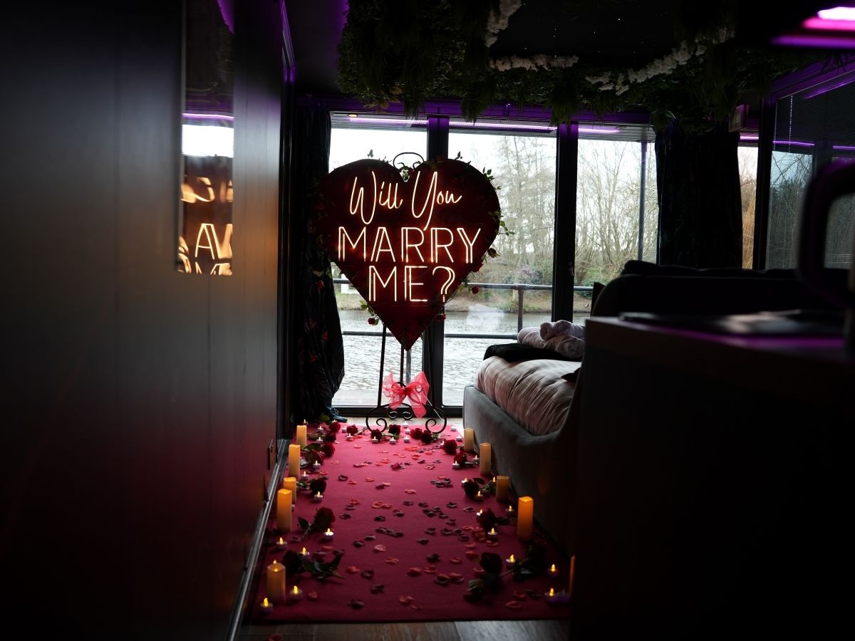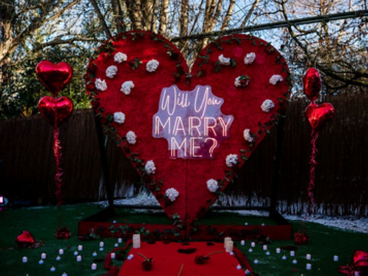 The big 'Will You Marry Me Sign' extra comes with rose petals, LED candles and a red carpet walkway as a set package of £225.