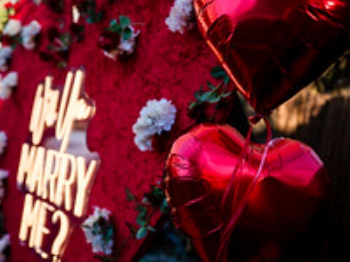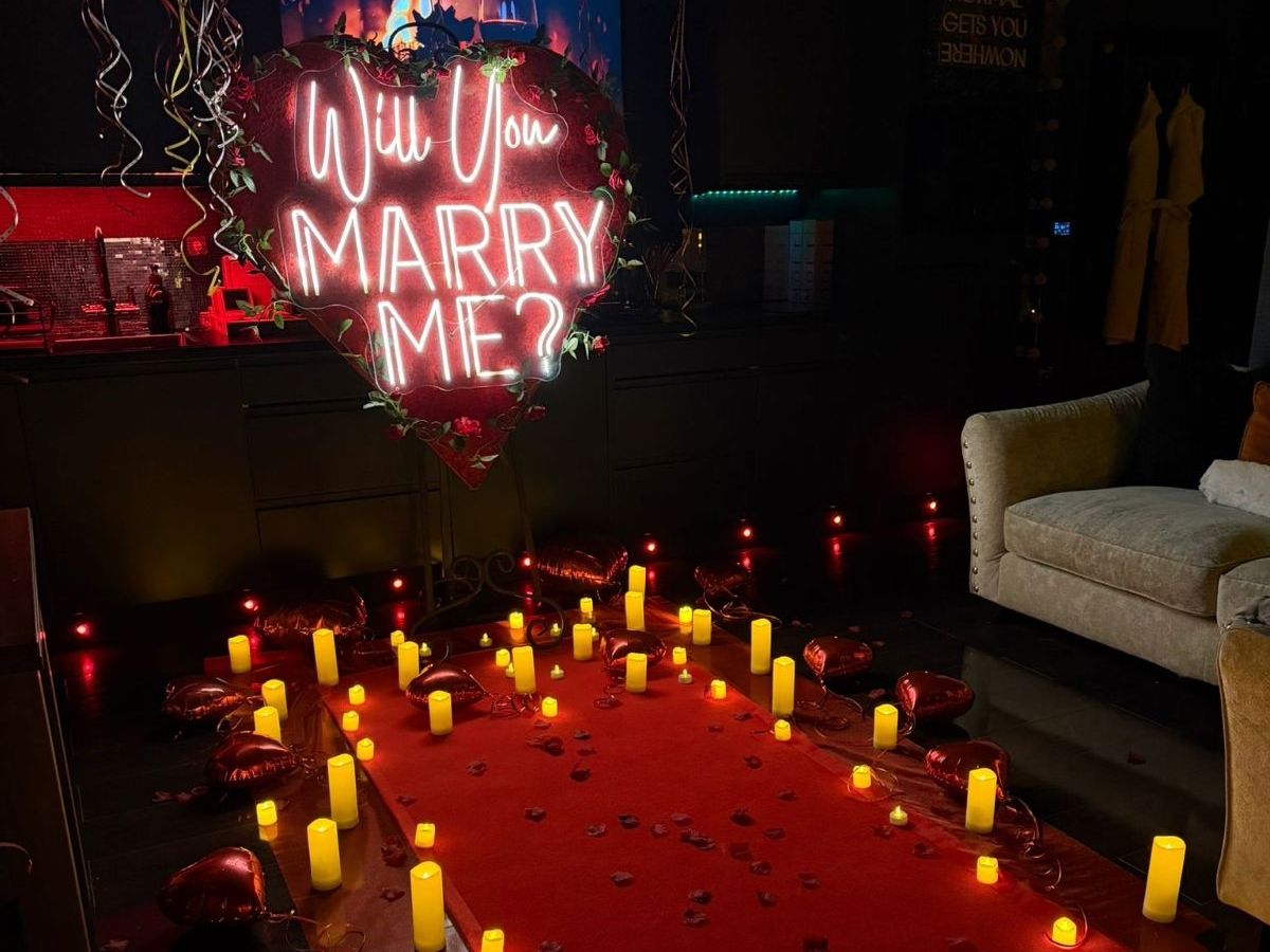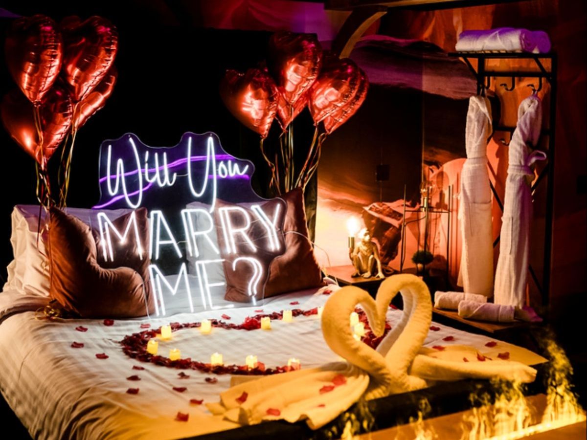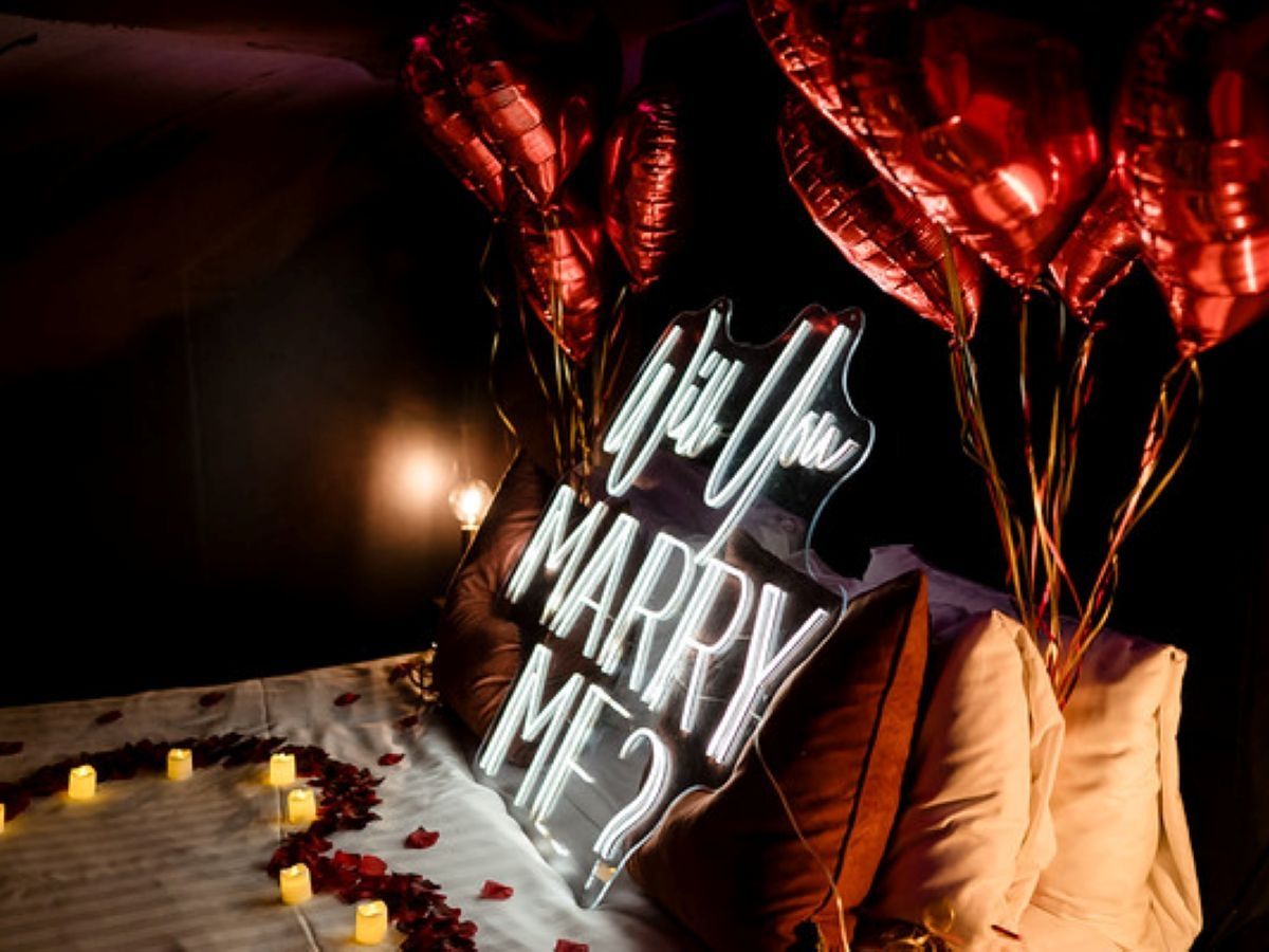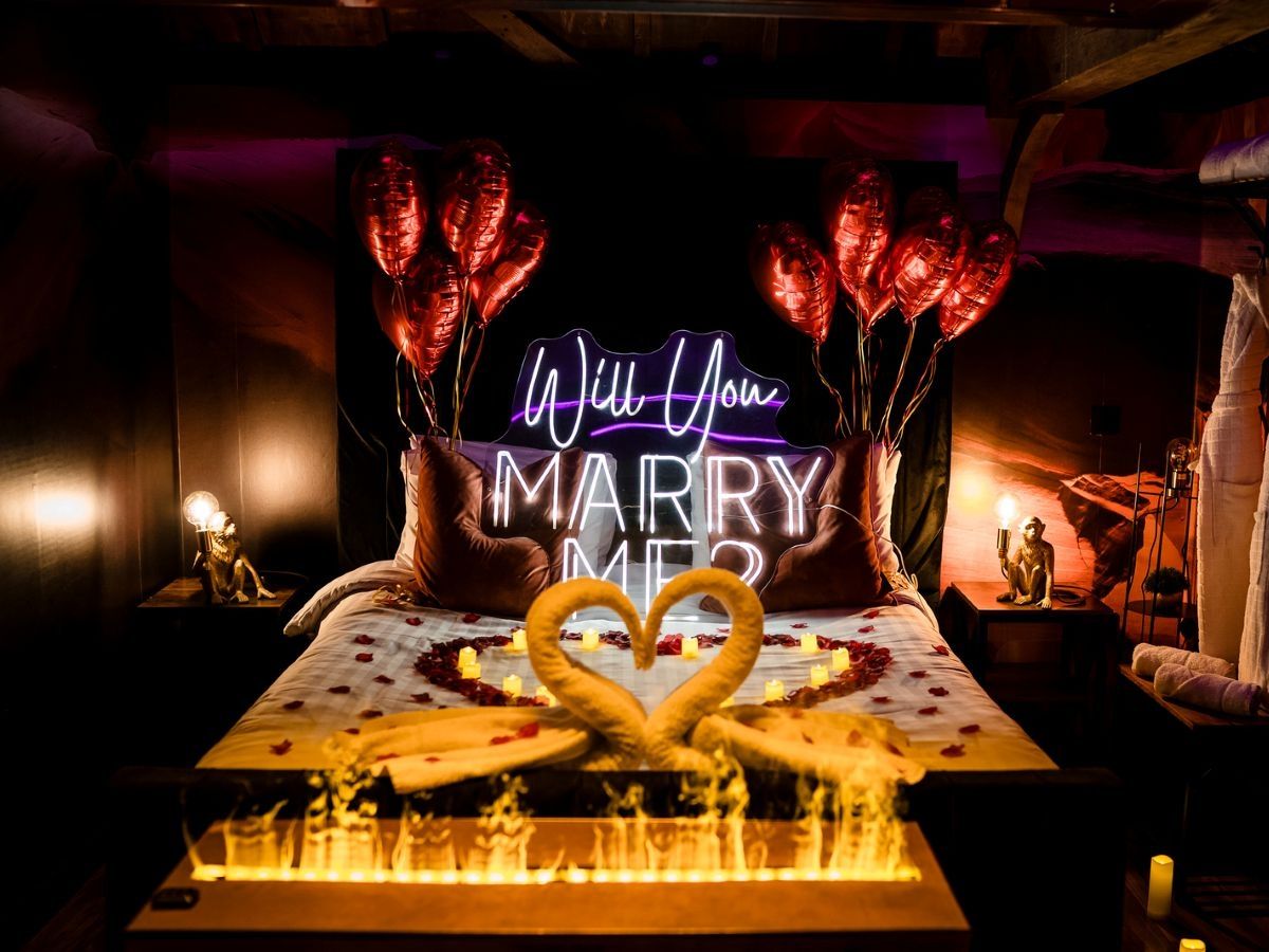 The big 'Will You Marry Me Sign' extra comes with rose petals, LED candles and a red carpet walkway as a set package of £225.